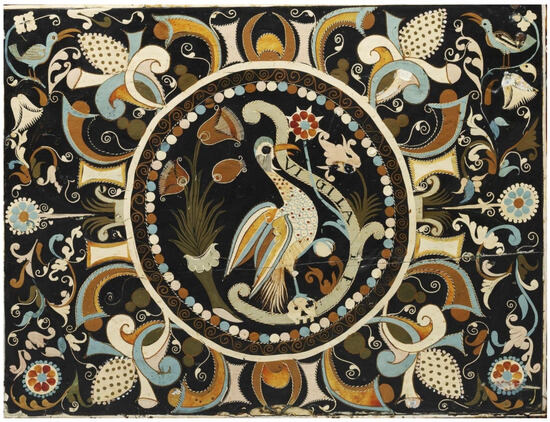 “VIGILATE” impresa. Table cabinet, interior of fall-front, Pasto Colombia, ca. 1630–1643. New York, The Hispanic Society of America, LS2446.