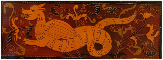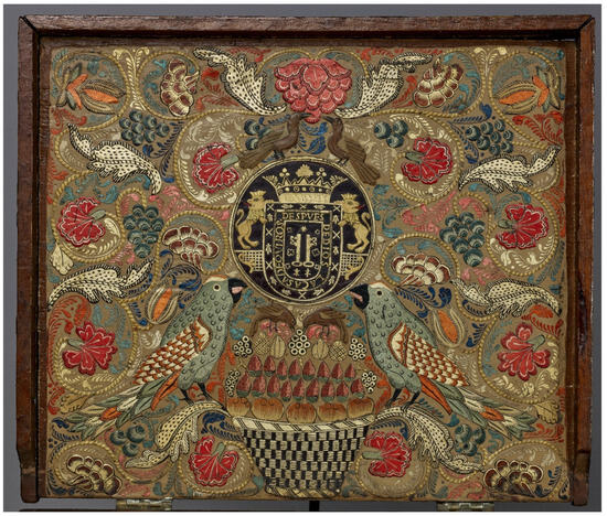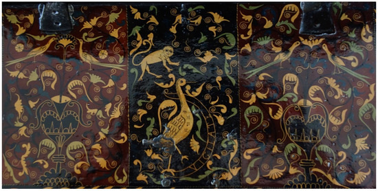 Most of these influences are combined on a table cabinet ca. 16848 that, without doubt, was commissioned by the bishop of Popayán, Cristóbal Bernardo de Quirós (1618–1684), as a gift for his brother, Gabriel Bernardo de Quirós, secretary to Charles II, who had been granted the title of Marquis of Monreal on 27 December 1683 [24]. The exterior of this table cabinet exemplifies the fusion of Asian and Indigenous motifs, where the squirrel-and-grapevine motif has been reinterpreted with an endemic monkey-and-passion flower vine motif (Figure 24 and Figure 25).