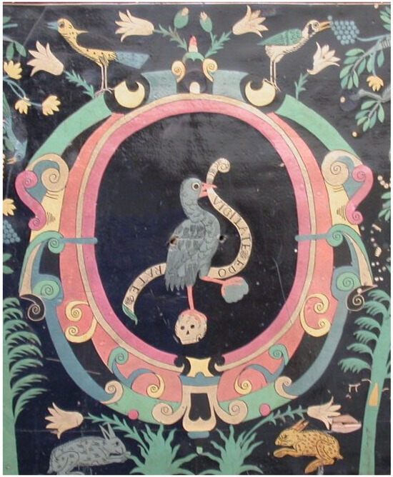 Similar comparisons are possible on three early matte barniz de Pasto table cabinets with hinged fall-fronts and hinged lids in the Victoria and Albert Museum, The Hispanic Society of America, and in the collection of Francisco Marcos Manzano, Salamanca, Spain, all dating from 1625 to 1650. All three cabinets show striking similarities in their iconography. Each incorporate an impresa with a motto in the decorative scheme, and one impresa appears on all three with the figure of a crane and a ribbon banner with the motto in Latin “VIGILATE” or “VIGILATE ET ORATE”7; in English “Be watchful” or “Watch and pray” (Figure 16, Figure 17 and Figure 18).