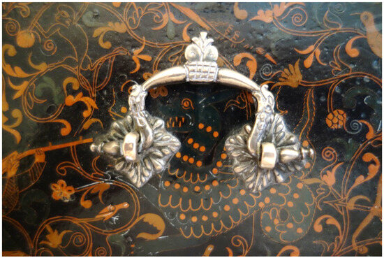 Of all known examples of barniz de Pasto from the earliest period (1625–1650), the silver fittings on this table cabinet are truly exceptional, especially the ornate lock escutcheon and hasp (Figure 11). The lock escutcheon is chased and engraved with a Renaissance-style sculptural hasp with the half figure of a herm, borrowed from ancient Greek sculpture.