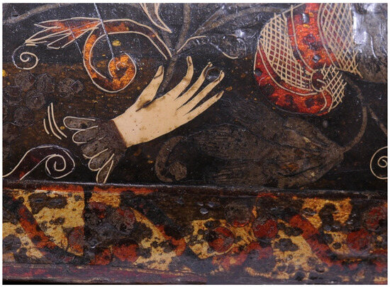 Another unusual European motif, that of a white hand, only appears on a few early pieces of barniz de Pasto dating from the period of 1625–1650. The exact symbolism of the hand is unclear, other than being a clever decorative motif. The Hispanic Society’s casket (LS2067) includes seven white or flesh-colored hands, a scalloped sleeve cuff at the base of the hand, and black outlines for the fingernails, all of which are positioned at the bottom center above the border on all four sides, and at bottom front and back center of the domed lid, two on the front and one on the back. The hands in matte barniz stand out in high contrast with the barniz brillante that covers the rest of the casket. With the thumb and index finger, the hand holds the stem of flowers that rise upward and spread to the sides (Figure 22).