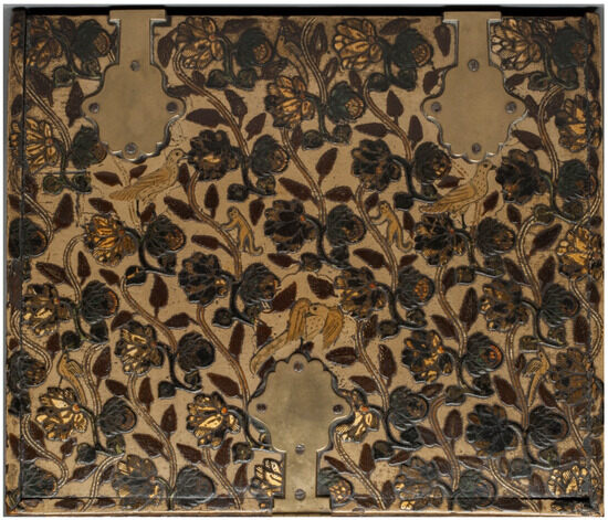 The subtly curved edges and slightly elevated fall front of the table cabinet more closely resemble early seventeenth-century Japanese Namban-style lacquer cabinets produced for the European market rather than traditional Spanish models (Figure 26). The synthesis of these diverse artistic and cultural traditions is most evident on the interior of the lid (Figure 27 and Figure 28).
