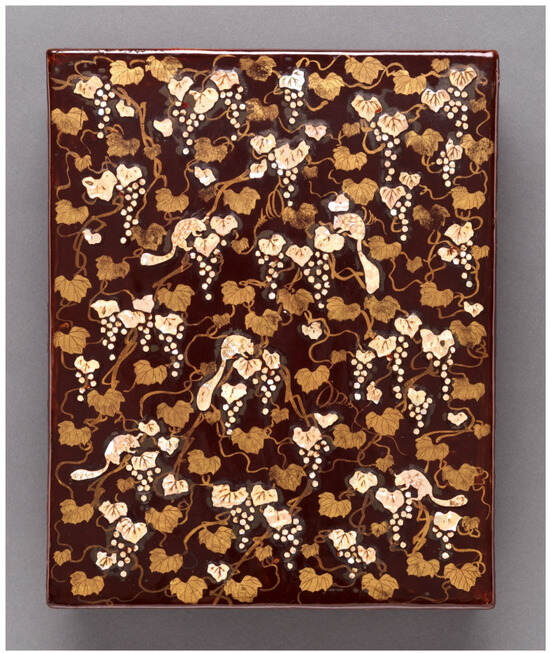 Writing box with decoration of grapes and squirrels, top exterior, Japan (Ryūkyū Islands), 17th century. Black lacquer with mother-of-pearl inlay and gold painting, 6 × 26.2 × 21.6, New York, The Metropolitan Museum of Art, 2020.323.11a–e.