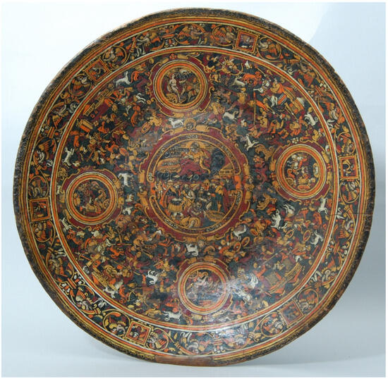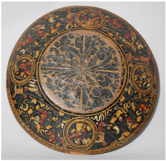 Two Peribán-domed writing cabinets (bufetillos) in the collection of the Monasterio de las Descalzas Reales in Madrid most likely were a gift from Philip IV, King of Spain (1621–1665), or from a high Church official or member of the nobility, to the Discalced Carmelite nuns (inv. 00612072-73) [10]. Both writing cabinets display scenes of triumphal chariots and courtly figures. The same applies to a batea in the Conceptionist convent at Ágreda, Soria, home to the mystic Sister María de Ágreda (1602–1665), who was a long-time correspondent and advisor to Philip IV [10]. All three of these pieces, in their overall design and idiosyncratic style of depicting human and animal figures, are indications of having been produced in the same workshop between 1625 and 1650.