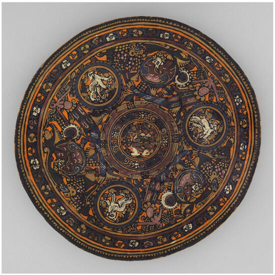 Tray (batea), Peribán, Michoacán, ca. 1675. Mexican lacquer on wood, 5 cm × 43 cm, London, Victoria and Albert Museum, 158–1866.