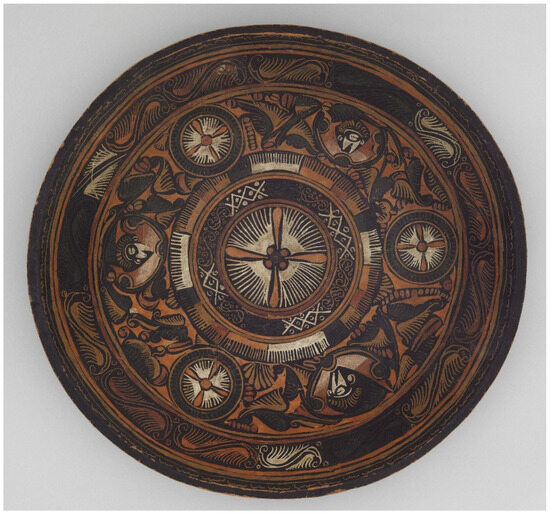 The evolution of the principal designs and motifs on Peribán over the course of the seventeenth century provides a means for setting approximate dates for extant pieces as they go from finely detailed to conventionalized. The figure of a siren, or winged mermaid, and the accompanying designs seen on the gourd cup in Pereda’s still life of 1652 are similar to those on the reverse of both bateas in The Hispanic Society of America, as well as the decoration on the front of a batea ca. 1675 in the Victoria and Albert Museum (Figure 33, Figure 34 and Figure 35).