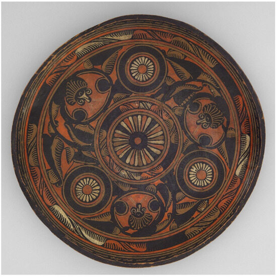 | 10. | Batea (tray), Peribán, Michoacán, Mexico, ca. 1625. Mexican lacquer on wood, 8 cm × 56.5 cm. New York, The Hispanic Society of America, LS1808. Provenance: Arabella D. Huntington (1850–1924), New York, until 1924; estate of Arabella D. Huntington, New York, 1924–1926; Martin Cohen, New York, 1998; acquired by The Hispanic Society of America, 1998. |