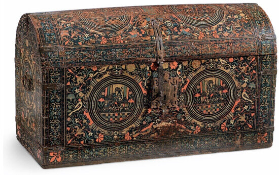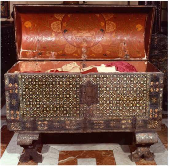 Trunk (baúl), Peribán, Michoacán, ca. 1650–1675. Mexican lacquer on wood, iron fittings, Palace of the Countess of Lebrija, Seville, Spain.