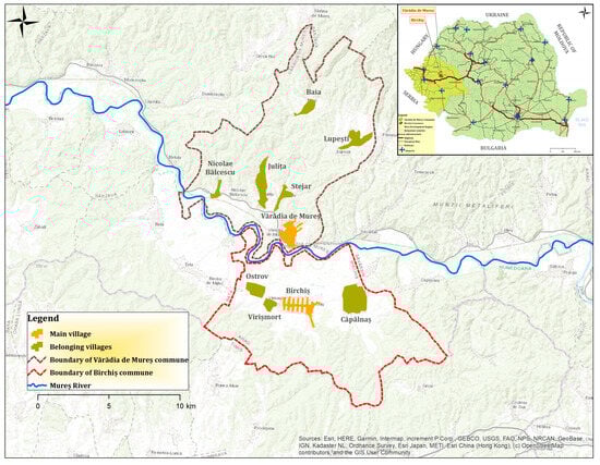 In line with these arguments, this paper explores rural landscapes and local rural identity and its relationship to broader regional identity, more specifically the question of us and the other, as exemplified by territorial rural identity representation in a particular part of Romania that is divided by the river Mureș. Our selected case study sets out to portray the role of water/the river and its related cultures in the social and cultural construction of this region and its specific rural places, arguing that the culture of water [9,10] and the local cultures closely connected to the natural features of a place are responsible for the construction of the local and regional identities of specific places and regions. The Mureș is one of Romania’s major rivers and the largest tributary of the river Tisa, into which it flows after crossing the border into Hungary. With its main course of 789 km (of which 761 km are in Romania), it is one of the most significant flowing waters in the Carpathian basin. Furthermore, the river has been a boundary throughout history, serving as a border between various countries and even empires (the Kingdom of Hungary, the Ottoman Empire, and the Habsburg Empire). It is a natural element functioning both as a boundary and as a highway linking different cultures, communities, and people. Of the countless rural settlements lying along this river, Vărădia de Mureș and Birchiș represent two small, interesting communities with specific rural identities. Vărădia de Mureș is located on the northern side of the Mureș and is part of the historical region of Crișana, while Birchiș lies to the south of the Mureș and is part of the historical region of Banat.