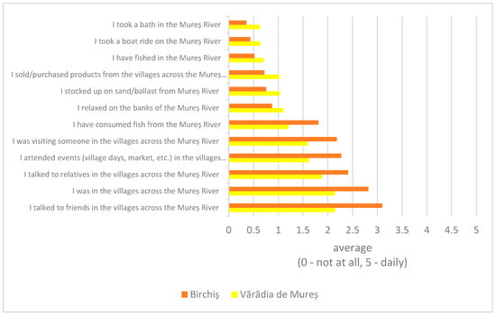 Further to this, respondents were also given a list of 12 activities connected with the Mureș and the villages across the Mureș and were asked to state which of them they had participated in during the past year and how frequently. Their answers show clearly that people from Birchiș spent more time visiting or simply talking to their friends or relatives on the other side of the Mureș. It can also be seen that they went more often to parties held in villages across the river and to the food and clothes market that takes place in Săvârșin every Thursday. Eating fish from the river was also a more regular feature of their lives. The inhabitants of Vărădia de Mureș made greater use of the Mureș in their leisure time, as evidenced by the statements about bathing, fishing, relaxing, and boating on the river (Figure 5).