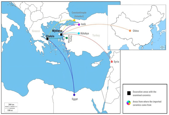 Over the last several decades, the use of material analysis to examine the compositions and manufacturing processes of ancient glazed ceramics has developed as a field of study. This is due to the fact that pottery has always been the main topic of archaeology research, with various perspectives (art history, economics, everyday life, etc.) explored. Although significant studies of Near and Far Eastern glaze compositions and colour recipes have been conducted [1,2,3,4,5,6,7,8,9,10,11,12,13,14,15,16,17,18,19,20], the full range of research attention is often lacking. During the Medieval to Post-Medieval periods, pottery was widely produced in Western Anatolia and East Asia, especially at important urban centres such as Constantinople (Istanbul), Iznik, and Kütahya (Figure 1). Because of their strategic locations at intersectional points along the Silk Road, these urban centres had a significant political, economic, and military role in Western Anatolia and East Asia. Numerous distinct handicraft production sites have been identified in various parts of these cities, with pottery production being one of the most significant, at least from the 9th century onwards. For this purpose, the colour pigments and glaze recipes of 40 ceramic fragments from Western Anatolia and East Asia collected within the Castle of Mytilene and Chalcis in Greece were investigated in this study (Table 1; Figure 1 and Figure 2). The selection of the number of fragments in each class depended on the available archaeological material.