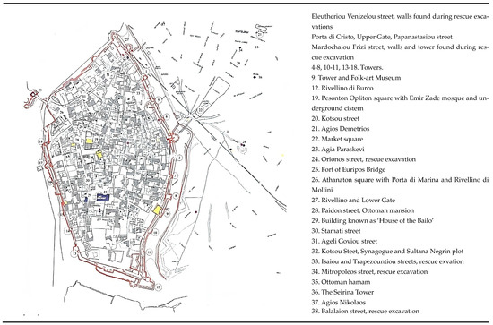 Plan of Chalcis in Euboea combining the 1840 topographic plan and the modern settlement grid with the locations mentioned in the text [37] (p. 57).