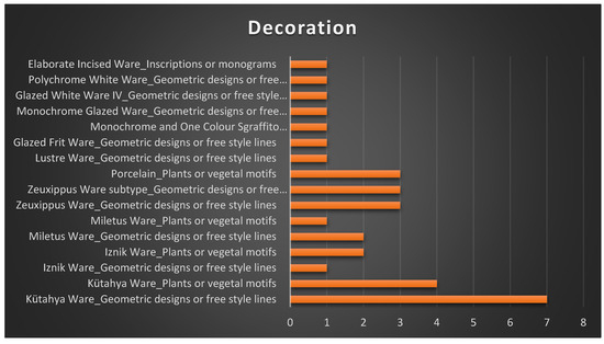 Following the decoration types listed in descending order (Table 1), the Kütahya Ware samples have geometric designs/free style lines or plants/vegetal motifs, the Iznik Ware samples have plants/vegetal motifs or geometric designs/free style lines, and the Miletus Ware samples have geometric designs/free style lines or plants/vegetal motifs. In addition, the Zeuxippus Ware sample and the Zeuxippus Ware Subtype sample have geometric designs/free style lines, and the Porcelain samples have plants/vegetal motifs. The Lustre Ware sample, the Glazed Frit Ware sample, the Monochrome and One Colour Sgraffito Ware sample, the Monochrome Glazed Ware, the Glazed White Ware IV sample, and the Polychrome White Ware sample only have geometric designs/free style lines. Finally, the Elaborate Incised Ware sample has inscription/monogram. Lastly, some of the Kütahya Ware, Zeuxippus Ware, Zeuxippus Ware Subtype, Porcelain, Glazed Frit Ware, and Glazed White Ware II samples have no decorations (Figure 5).