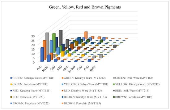 According to the analysis of the chemical composition of the colours through Scanning Electron Microscopy (SEM-EDS), the colourant of yellow colours of Kütahya Ware fragments (MYT181, MYT242) was Fe (0.6–0.9%). The red colour of Kütahya Ware and Porcelain was Fe (0.8–1.1%); however, in Kütahya Ware MYT183, it was both Fe (1%) and Mn (0.8%), and in Iznik Ware MYT214, it was Cu (0.4%) and Sn (2.9%). In conclusion, three different recipes for red colour were noticed in the pottery collection under study; regarding the brown colour, two were noticed: Kütahya Ware and Porcelain Wares. In the first recipe, the main colourant was only Fe (1.3–3.4%). The second recipe was observed in samples of Kütahya Ware (MYT183), consisting of Co (0.4%), Fe (1.3%), and Mn (1.8%), and in samples of Porcelain (MYT185), consisting of Co (0.5%), Fe (1.2%), and Mn (2.3%) (Table 5; Figure 6).