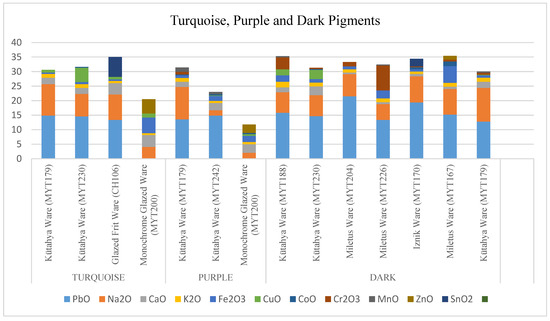 The colourants of green colours of fragments of Kütahya Ware, Iznik Ware, and Porcelain were Cu (0.2–2.4%) and Fe (0.6–2.1%). An Iznik Ware sample (MYT168) also contained Sn (4.1%). Dark green pigments had Cu >2%. In conclusion, the potters followed the same recipe for green colour. Three recipes were also observed in reference to purple colours. The first one was noticed in the Kütahya Ware sample (MYT179) with Fe (0.9%), Mn (1.5%), Co (0.3%), and Cr (0.9%). The second one was in the Kütahya Ware sample (MYT242) with Fe (1.7%), Mn (0.8%), Co (0.4%), and Cu (0.2%). Finally, the third one was in the Monochrome Glazed Ware sample (MYT200) with Fe (2.1%), Cu (0.6%), and Co (0.4%). The purple colour of the Monochrome Glazed Ware (MYT200) also contained Zn (2.9%) and Ti (31%) (Table 5; Figure 6).