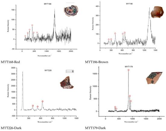 According to Raman analyses, the red and brown colours came from Hematite (Fe2O3) or Magnetite (Fe3O4). In some samples, the combination of both of them was observed [40,41]. The yellow colours mainly came from Yellow Ochre, Fe2O3, with clay and silica, and in some cases, in combination with Magnetite, Fe3O4 [40,41]. The green colour came from Malachite, CuCO3·Cu(OH)2, or Atacamite, CuCl2·3Cu(OH)2 [41]. The blue colours came from Lazurite, Na8[Al6Si6O24]Sn, or Azurite, 2CuCO3·Cu(OH)2, but the turquoise colour came from Cu in Pb [40,41,42,43,44,45]. Finally, the dark colours came from different compositions, specifically Chromium oxide, Cr2O3; Magnetite, Fe3O4; Hematite, Fe2O3; Chromium oxide, Cr2O3; Magnetite, Fe3O4; and a combination of Cr, Al, and Fe [40,42,43] (Table 7, Figure 8).