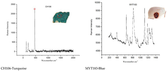 - Burgio, L.; Clark, R.J.H. Library of FT-Raman spectra of pigments, minerals, pigment media and varnishes, and supplement to existing library of Raman spectra of pigments with visible excitation. Spectrochem. Acta Part A 2001, 57, 1491–1521. [Google Scholar] [CrossRef] [PubMed]