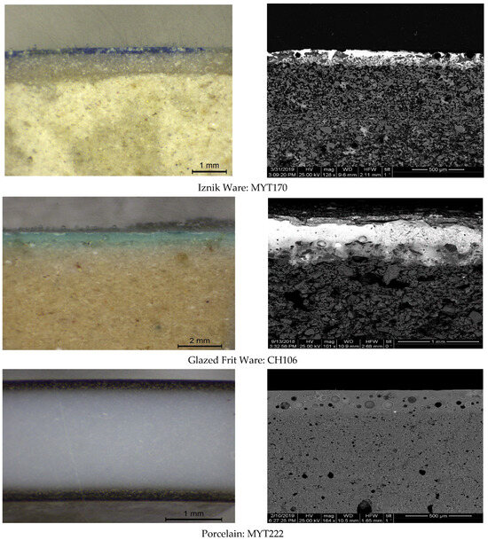 Furthermore, Porcelain and fritware fabrics of Iznik Ware were made of a high-quality pure white clay fabric. The Iznik Ware pieces were alkali fritwares, and their fabric recipe was the standard Iranian soda–alkali frit recipe due to the type of alkali used and, specifically, almost equal parts of pounded quartz stone and calcined soda plant. Finally, the Monochrome Glazed Ware sample (MYT200) had a fritware fabric. Through XRF and SEM-EDS analyses, it was observed that the sample Kütahya MYT230 had a different chemical composition, which indicates that it is not an original Kütahya sample but an imitation. Moreover, although Polychrome White Ware, Glazed White Ware II, and Glazed White Ware IV came from Constantinople (Istanbul); they had different raw materials, and this information leads to the conclusion that they were probably manufactured in different workshops.