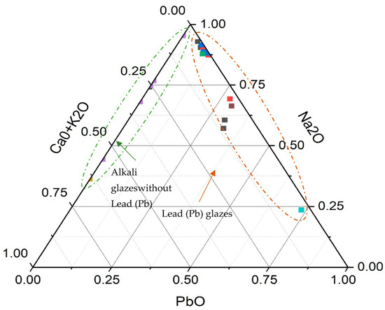 Regarding the chemical composition of the glazes through Scanning Electron Microscopy (SEM-EDS), Kütahya Ware fragments contained PbO 12–25%, CaO 1.9–6.2%, K2O 0.7–4%, and Na2O 1–12%, and they had lead alkali glazes. One sample of Kütahya Ware (MYT183) was an alkali glaze that contained CaO 6.2%, K2O 2.8%, and Na2O 1.7%. Iznik Ware fragments contained PbO 19–30.5%, CaO 0.7–2.5%, K2O 0.6–0.7%, Na2O 2–9%, and SnO2~2%, and they were lead alkali glazes. Miletus Ware fragments contained PbO 18–26%, CaO 0.6–0.9%, K2O 0.9–1.9%, and Na2O 7.3–10.3%, and they were lead alkali (soda) glazes. Glazed Frit Ware samples contained PbO 13.4–20%, Na2O 6.5–8.7%, CaO 2.8–3.9%, and K2O 0.8–1.7%, which were lead alkali (soda) glazes. Porcelain samples contained CaO 5.2–9.7%, K2O 1.1–2.9%, and Na2O 0.5–11%, and they had an alkali glaze. The Monochrome Glazed Ware fragment contained CaO 2.9%, K2O 0.8%, and Na2O 2.1%, and it had an alkali glaze. Zeuxippus Ware contained PbO 32%, CaO 0.9%, K2O 0.4%, and Na2O 0.3%, and it had a lead glaze; and Lustre Ware contained PbO 23%, CaO 1%, K2O 1.9%, Na2O 1.9%, and SnO2 4.5%, and it had a lead alkali glaze. In comparison, Iznik Ware fragments (MYT168, MYT170, MYT214) contained SnO2 1.3–2.4%, while the Kütahya Ware sample (MYT184) contained SnO2 2–3%; Porcelain (MYT186, MYT221, and MYT222) contained TiO2 0.2–0.5%, and Monochrome Glazed Ware fragments (MYT200) contained ZnO 2.9% [19]. The different chemical compositions of the glazes are shown in the ternary diagram (Table 8; Figure 9 and Figure 10).