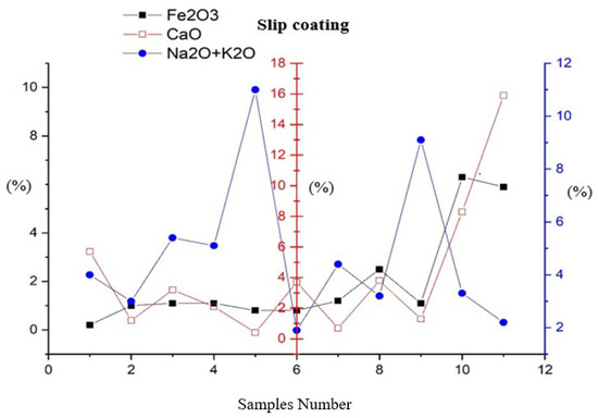 According to measurements of slip coatings of ceramics from Mytilene in Lesvos (Kütahya Ware, Miletus Ware, and Iznik Ware) by Scanning Electron Microscopy (SEM-EDS), the percentage of Fe2O3 was low, about 0.2–2.5%. The CaO content was 0.4–5.7%. The fluxes Ca, K, and Na had a ratio of 5.3:5.3:3. The exception was the sample of Monochrome Glazed Ware (MYT200), which had a high percentage of Na2O (9.1%) and TiO2 (33.3%). Also, the Kütahya Ware (MYT183) sample had a high percentage of Fe and Cr due to the diffusion of the pigments into the slip coatings. The slip coatings of Zeuxippus Ware (CH101) and Lustre Ware (CH110) had higher percentages of Fe and Ca than the previous samples (Figure 9). Specifically, the percentage of Fe was 5.9–6.3% and that of Ca was 8.3–15.9%. The fluxes Ca, K, and Na had a ratio of 7.6:1:0.1. Finally, a significant difference was observed in the slip coatings of the Iznik and Kütahya Ware fragments. Iznik Ware sherds contained SiO2 80%, Na2O 4%, CaO 3%, and K2O 0.7%; Kütahya Ware sherds contained SiO2 88%, CaO 4%, Na2O 1.5%, and K2O 2% (Table 8; Figure 9). Both of them were fine, white slip coatings of a quartz-frit type, which was used as the ground for the painted decoration. The layer of slip coating was observed in all types of pottery, apart from fragments of Polychrome White Ware, Glazed White Ware II, Glazed White Ware IV, Glazed Frit Ware, and Porcelain, which did not have this layer. Furthermore, glaze diffusion existed in some slip coatings (Table 9; Figure 11).