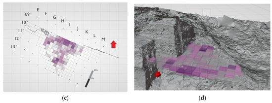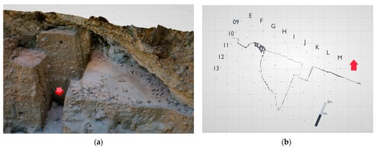 (a) Photogrammetry of the rock shelter cavity and its orientation; (b) a top view of the cavity showing the excavation squares identified by letters and numbers. The red arrow represents the north direction.