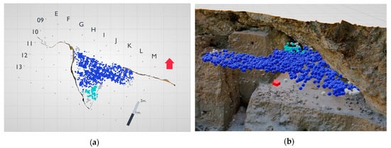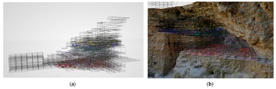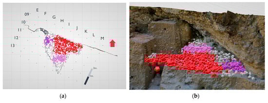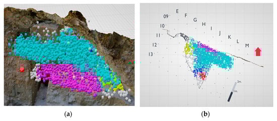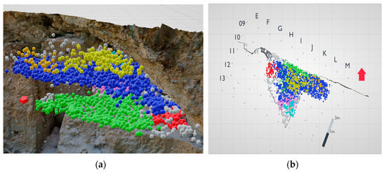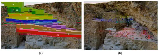 (a) The excavation’s rear view displaying all volumetric sector grids; (b) the cavity, incorporating volumetric sector grids and artefacts. The figures show the following colours by unit: light green, 1A; dark green, 1B; orange, 2C; yellow, 2D; blue, 3E; cyan, 3F; indigo, 3G; brown, 4H; beige, 4I; pink, 4J; red, 5K.