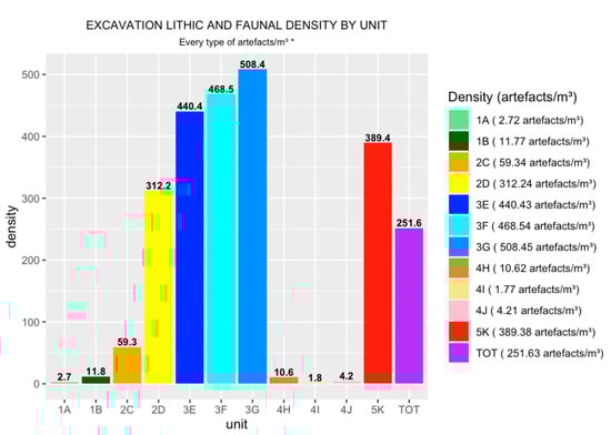 Furthermore, we know the volume of each spatial sector. Consequently, we can calculate the cubic metres of the lithostratigraphic unit that embraces it and the total volumetric value occupied by the entire excavation (total volume: 16,651 m3) [Figure S26]. Knowing the volumetric proportions of the levels and units in the excavation [Table 7] and the total number of elements that share these two attributes in the whole site, we can infer whether the calculation made at each level and each unit is relevant and statistically significant. According to this criterion, we dismissed the comparisons that were not representative.