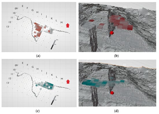Level 2 and unit 3E GNN analysis. (a) GNN central interconnectivity group top-view in terracotta-red colour; (b) central group within the cavity in terracotta-red colour; (c) GNN northeastern interconnectivity group top-view in turquoise colour; (d) northeastern group within the cavity in turquoise colour. The red arrow represents the north direction.