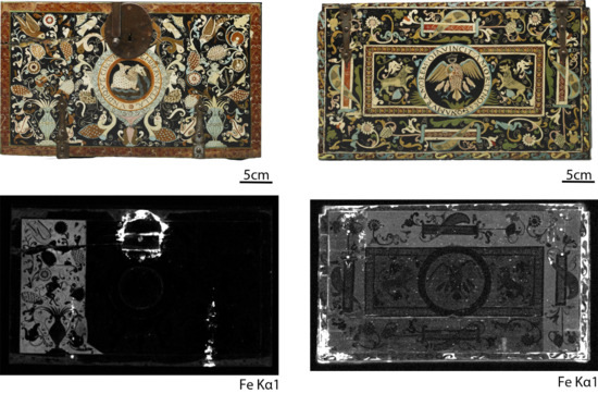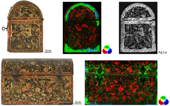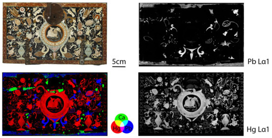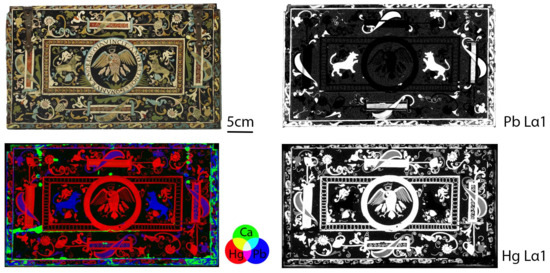Proper left side (top) and back (bottom) of the casket: the XRF maps show in red the location of the original mercury white decoration and in white the distribution of silver; calcium and lead are shown in green and blue, respectively, and indicate areas of recent intervention.