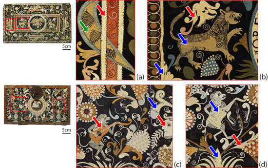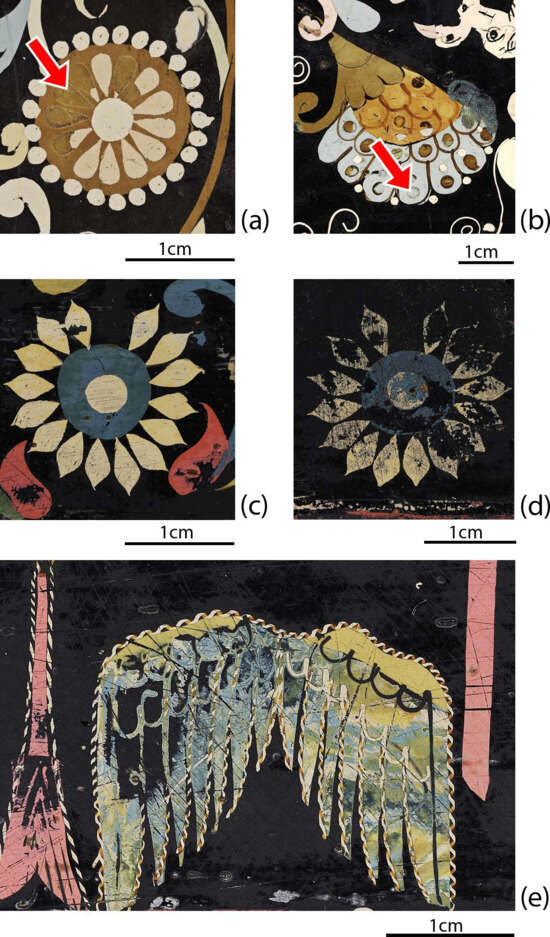 An overview of the colours seen on the cabinet and a selection of high-resolution images and XRF maps are in Supplementary Material S2, including evidence that some of the mopa mopa sheets may have been enriched in iron during the manufacturing process.