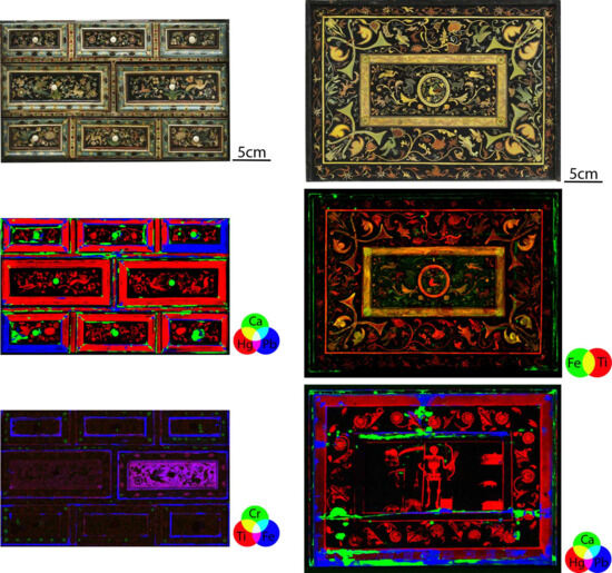 Drawers (left) and the inner surface of the lid (right): in the drawers, the elemental maps of lead, mercury, calcium, chromium, titanium and iron outline early repairs and restoration; on the inner surface of the lid, titanium and iron outline the late 20th century overpaint, while calcium and lead are ascribed to earlier interventions.