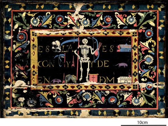- A decorative scheme including a skeleton was present on the inner surface of the lid, which had been covered with a much later, probably professionally painted scheme, a pastiche of other barniz areas in the cabinet;