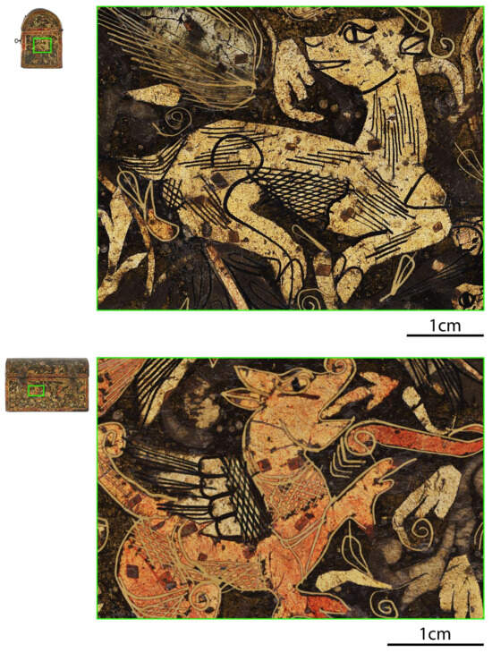 Details of the barniz brillante decoration of the casket, taken with the polarised light filter to reduce the glare of the metal leaf.