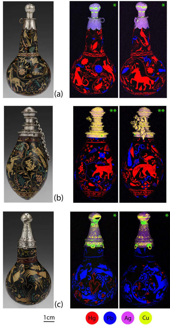 The three V&A gourds (from top to bottom: 28–1866 (a), 268–1879 (b) and 1577–1902 (c)), with XRF maps showing the distribution of mercury (Hg), lead (Pb), silver (Ag) and copper (Cu). The bright green colour represents zinc in maps with a single asterisk (*) and iron in maps with a double asterisk (**).