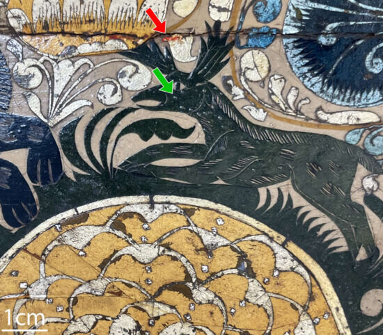 Detail of the tray showing vibrant red colour revealed during cleaning (red arrow), blistering on dark green mopa mopa (green arrow), and combination of matte and brilliant techniques.