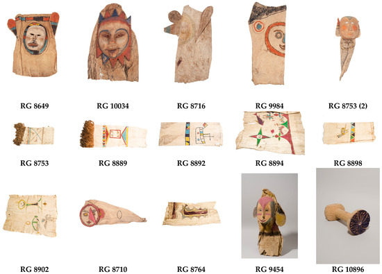 From the MAE (Figure 1), the considered items were collected by Harald Schultz (1909–1965) in 1958 (RG 8649, RG 8710, RG 8716, RG 8753, RG 8753 (2), RG 8764, and RG 10896) or 1956 (RG 8889, RG 8892, RG 8894, RG 8898, RG 8902, RG 9454, and RG 9984). It is important to note that the collection dates do not necessarily reflect the actual production dates of the items; the same is true for the items from the Peabody and Fowler Museums. For mask RG 10034, no date information was found. Other details from these items can be found in the Supplementary Materials.