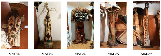 From the Magüta Museum (Figure 4), items MM374, MM383, MM384, MM385, and MM387 were selected. This collection was created with the participation of the Tikuna/Magüta people, and the museum is located in Benjamin Constant, Amazonas State, Brazil, close to the area where Nimuendajú conducted his research [31]. This collection was created between 1988 and 1991 (p. 100), and the masks are from the end of the 1980s (p. 105) [27]. However, the overpainting of some of the Magüta Museum’s items (p. 163) has been reported [27]. Therefore, items with potential overpainting, as determined by visual examination using visible light and UV radiation, were not considered for this research.