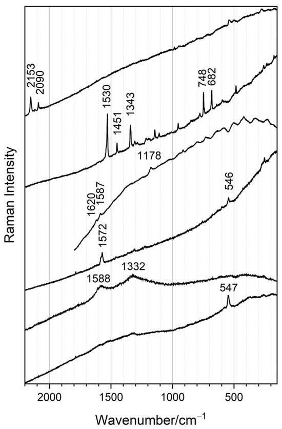 The presence of Prussian blue was identified mainly by the bands at ca. 2153 and 2090 cm−1, attributed to 1Ag and Eg (CN) stretching vibrations, respectively [32]. The presence of indigo was indicated mainly by the bands at ca. 1582 and 1572 cm−1, attributed to symmetric Ag stretching vibrations of (C=O), (C=C), and (C-C) modes [33]. Indigo spectra acquired were also compared to the ROD00176 Raman spectrum from the Infrared and Raman Users Group (IRUG) database. Ultramarine was indicated by its most intense band due to lazurite at ca. 545 cm−1, attributed to the symmetric stretching vibration of radicals S3− [34]. Phthalocyanine blue was identified mainly by the presence of bands at ca. 1530, 1451, 1343, 748, and 682 cm−1 [35], and the presence of crystal violet was verified by the bands at ca. 1620, 1587, 1178, and 915 cm−1 [36,37]. Amorphous carbon was identified by its two characteristic broad features at ca. 1575 and 1320 cm−1, assigned to the G and D bands, respectively [38]. The presence of anatase was suggested by the observation of its most intense band at ca. 143 cm−1. Anatase presents a high scattering cross-section, and because only low-intensity bands were observed, the results suggest that it is from a natural mineralogical impurity [39]. The presence of barium sulfate or lithopone was indicated by their most intense band at ca. 987 cm−1. Lithopone could be differentiated from barium sulfate by the observation of a medium-intensity band at ca. 342 cm−1 [40]. However, the low concentration and the luminescence background present in the spectra did not allow their differentiation.