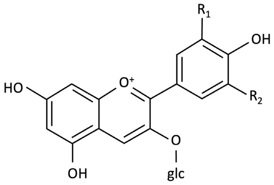 Chemical structures of cyanidin-3-O-glucoside (R1 = OH, R2 = H) and delphinidin-3-O-glucoside (R1 = OH, R2 = OH); glc = glycoside.
