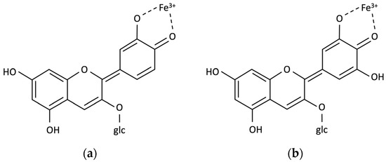 Supposing that the blue prepared from naīcü is indeed the result of the chemical reaction between iron ions and anthocyanins, the Tikuna/Magüta people have been mimicking one of the strategies that nature uses to fix the blue color, which is complexation with metallic ions. The blue in hydrangea, for instance, is attributed to a complex of Al3+ with delphinidin-3-O-glucoside and the copigment 5-O-caffeoylquinic [6]. For petals of Commelina communis, the blue hue is attributed to a structure composed of the anthocyanin malonylawobanin, the flavone flavocommelin, and ions Mg2+ in a ratio of 6:6:2 [6]. Similar supramolecular structures were proposed for Salvia patens and Salvia uliginosa (with anthocyanins, flavones, and ions Mg2+), and Centaurea cyanus and Nemophila menziezii (with anthocyanins, flavones, and ions Fe3+ and Mg2+). Other plants for which blue was related to the presence of anthocyanins and Fe3+ are Corydalis ambigua and Meconopsis grandis [6]. The effect of iron ions has also been investigated in similar systems [58], and a study evidenced that the chemical reactions between ferric chloride and cyanidin-3-glucoside and delphinidin-3-glucoside result in the formation of blue chelate complexes [59]. Therefore, it is reasonable to expect the formation of anthocyanin–Fe3+ chelates of cyanidin-3-O-glucoside and delphinidin-3-O-glucoside for the blue produced by the Tikuna/Magüta people, resulting in structures similar to those proposed in Figure 7. This reasoning will form the basis for future investigations including the community, as detailed above.