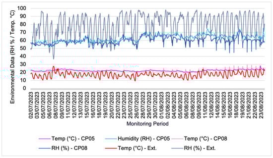 There are a few limitations to this study. The first being the loss of data from the logger on the ground floor of House Mill. This meant that an analysis of the differences in environmental data could not be established. Ideally, a larger sample of buildings would have been assessed, which would have provided a more comprehensive overview of the issue of overheating. It is also important to note that despite the UK summer of 2022, according to the Met Office [], ‘of ten of the warmest summers on record by mean temperature, summer 2023 is the wettest’. It was also stated that July was the ‘UK’s sixth wettest July on record’. Despite the summer season of 2023 being 0.8 °C warmer than the average, the majority of the ‘dry days of warm summer sunshine’, brought about by high pressure, occurred in June. Wet and windy conditions then proceeded due to low-pressure systems for much of July and August, i.e., during the period of data collection for this research. These irregular weather conditions are likely to skew the collected data as recording for this study, for two of the three case studies did not begin until 28 June 2023, with all but a few days falling within the overcast second half of the season. This meant that a like for like comparison could not be achieved, although this does not detract from the valuable data that were collected. The overheating risks not only concern their thermal comfort but also their health and well-being when using the building. It also could affect the usability of the building. The primary risks that we explored in this paper are risks concerning indoor environmental quality. There are other risks associated with overheating in historic buildings, including risks to the building fabric and objects. The impact of overheating on heritage buildings and artefacts is beyond the scope of this paper.