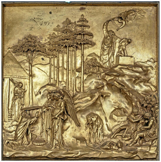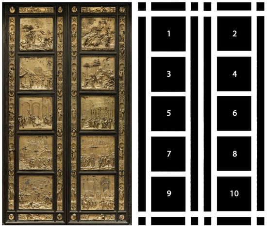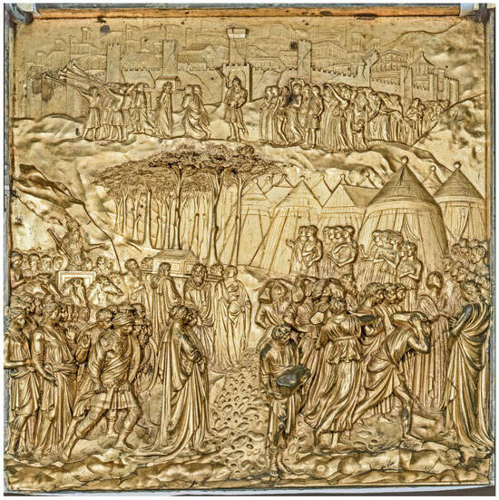 Secondly, from the iconographic point of view, the work presents a marked difference from the previous production, even by the same artist. In fact, Ghiberti also realized the twenty-eight panels of the second door (1403–1424) of the Baptistery1, representing the Stories from the Life of Christ. Ghiberti introduced an innovative feature in the third door (the Door of Paradise). This feature marked the transition from medieval to Renaissance art [3] (pp. 298–305), as defined in historical art circles: the Stories are set in a background of landscapes, both in urban and in rural scenarios. In the fifth, sixth, and tenth panels, the scenery, skillfully depicted in perspective, consists of monumental architectures of classical inspiration, while in the second, third, fourth, seventh, and eighth panels, Ghiberti depicts constructions related to the rural tradition.
