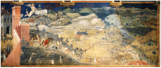 Painters like Giotto di Bondone (Colle di Vespignano Vicchio, 1267–Florence, 1337) and Simone Martini (Siena, 1284–Avignon, 1344) from the previous century included architectural structures and references to a recognizable natural or anthropic environment in their religious-themed paintings; these were, however, unrelated to the episodes depicted and closer to architectural structures and places that were known to the artists. The reference to Tuscan cities and countryside in these works is clear in the comparison with the shape of the plant arrangements and built elements, also depicted in paintings by contemporary artists, with the clear purpose of representing the territory. The case of the fresco ‘Allegory of the Effects of Good Government in the Countryside’ (Figure 2) by the painter Ambrogio Lorenzetti (Siena, 1290–1348) is emblematic, where the rows, fields, and trees follow the hills and are spaced by farms, churches, and castles that can be glimpsed in the distance, thus describing a rich and heterogeneous anthropized landscape, and in the center of it, there is a complex of farmhouses and a rectangular thatched hut with a strong symbolic character.