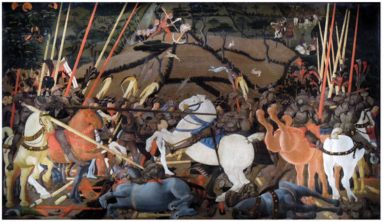 Paolo Uccello, Battle of San Romano (tempera on panel, 182 × 323 cm, 1435–1440, Uffizi Gallery in Florence) (credits: Paolo Uccello, public domain, from Wikimedia Commons).