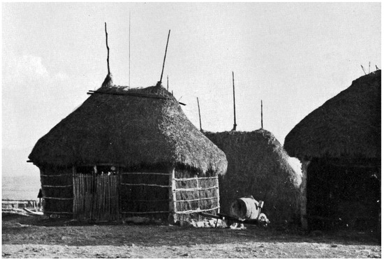 The hut is still common today in eastern Mugello and Valdisieve (municipalities of Vicchio, Dicomano, San Godenzo, Rufina, Londa), in the Tuscan Val Tiberina, in the Casentino, excluding the mountains, in the Val di Chiana and throughout the region, and in the southern area of the Ombrone, excluding the Maremma. More generally, its structure is similar to the cylindrical–conical huts with a central pole found throughout the sub-Apennines area, on both sides of the ridge; this construction involves a wooden structure of poles driven into the ground along the circular perimeter, subsequently filled in with reeds, branches, and straw with horizontal circles of branches. The central post with a fork termination constitutes the support for the roof beams, with a secondary frame in rafters to which the roof fronds are fixed [45] (Figure 9).