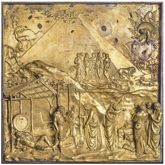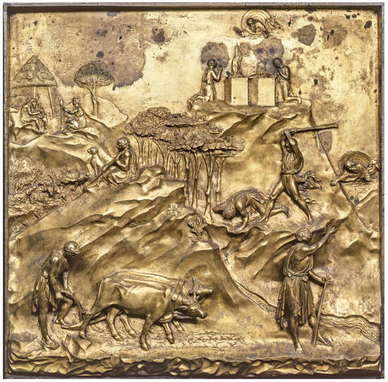 The scenes in the second, third, fourth, seventh, and eighth panels (sometimes up to nine events in the same square) are depicted against a background of landscapes that recall the area where the master was born and invested part of his fortune in land and farms. The depiction of the cultivated land, characterized by the presence of grains and tree species, in particular fruit trees, vines, and olive trees, is combined with the images of light structures and shelters, used either by the farmers (cf. ‘Stories of Cain and Abel’ and ‘Stories of Noah’) and as temporary dwellings (cf. ‘Stories of Moses’ and ‘Stories of Joshua’). In this way, the master goldsmith sculptor, while depicting biblical episodes set in decidedly different eras, embeds in his work a truthful and detailed snapshot of the contemporary agrarian landscape, providing a rare depiction of these architectural structures, commonly considered ‘minor’ if compared to well-known monumental buildings, and less frequently found in the pictorial and sculptural production of artists of the same period.