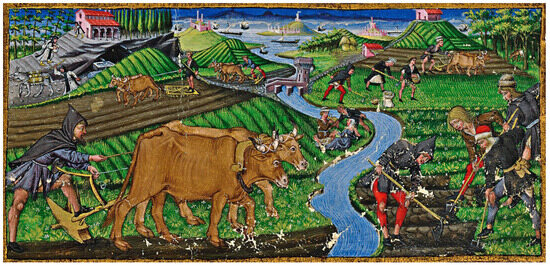 Works of art generally constitute an invaluable iconographic source, which in many cases enables us to grasp the identity of landscapes that took shape in distant times. The study of paintings, supported by the study of other available sources, is probably the most effective method to document the origins of the past rural landscape. In this regard, in fact, Emilio Sereni’s studies are famous; he considered the analysis of the landscape depicted in various works of art at different times to be the best path for the reconstruction of the history of agriculture [46] (pp. 111–112).