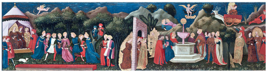 Finally, in ‘The Adoration of the Magi’ by (1439–1441) (Figure 6), the identifying elements of the rural area emerge strongly enough to balance the richness of the procession depicted in the foreground. In the foreground, there is a shelter shaped according to the local tradition: a structure of rectangular layout with four wooden posts at the vertices that support, by means of a fork, the gabled roof structure with thatched roofing.