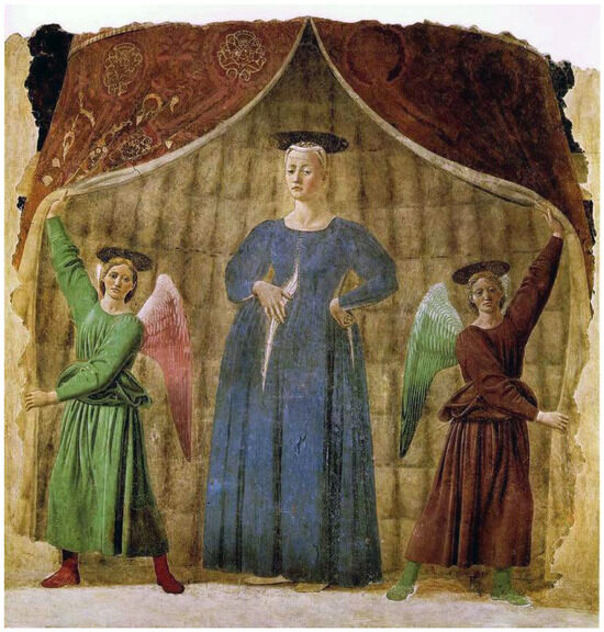 Piero della Francesca, Madonna del parto (fresco, 260 × 203 cm, 1455–1465, Monterchi—Arezzo) (credits: Piero della Francesca—Piero della Francesca, public domain, from Wikimedia Commons).