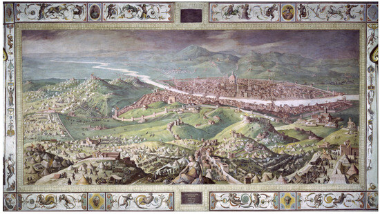 The persistence of this representational paradigm is testified by the repetition of the same reference in later works, such as the fresco in the Sala di Clemente VII in Palazzo Vecchio depicting the Siege of Florence (1529–1530) by Giovanni Stradano (Bruges, 1523–Florence, 1605), in which the troops stationed outside the City of the Lily are organized in a multitude of light structures surrounding the city walls (Figure 17).